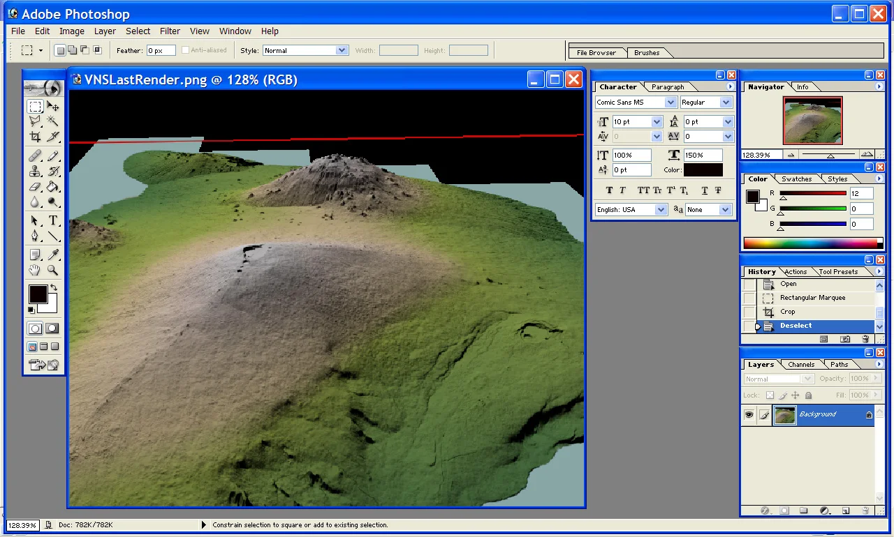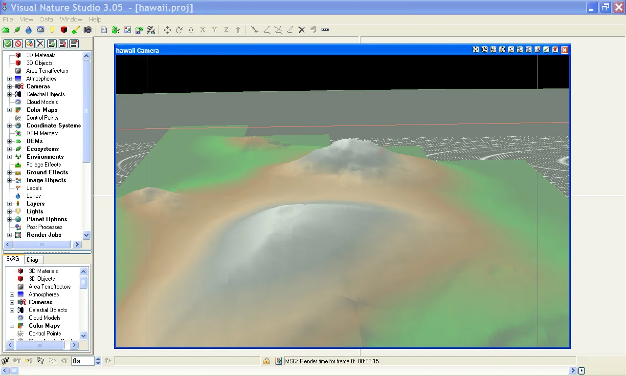 ... that Red Line in the background, at the top, is exactly 20.3000 North Longitude, Universal Transverse Mercator (UTM) projection, North American Datum of 1983 (NAD83) ... thanks to the integration of John Snyder's (USGS) General Cartographic Tranformation Package (GCTP) into VNS Version 1 by the people at 3D Nature; ... and the Red Line is the northern boundary of my overhead shot from 25 kilometers up in VNS Version 3 ... see "Example of Imaginekind Work" link at the bottom of each webpage on this site ... and now, this is the same scene; but as hypsometric (elevation) Ground Effects, as seen in Abobe Photoshop ...